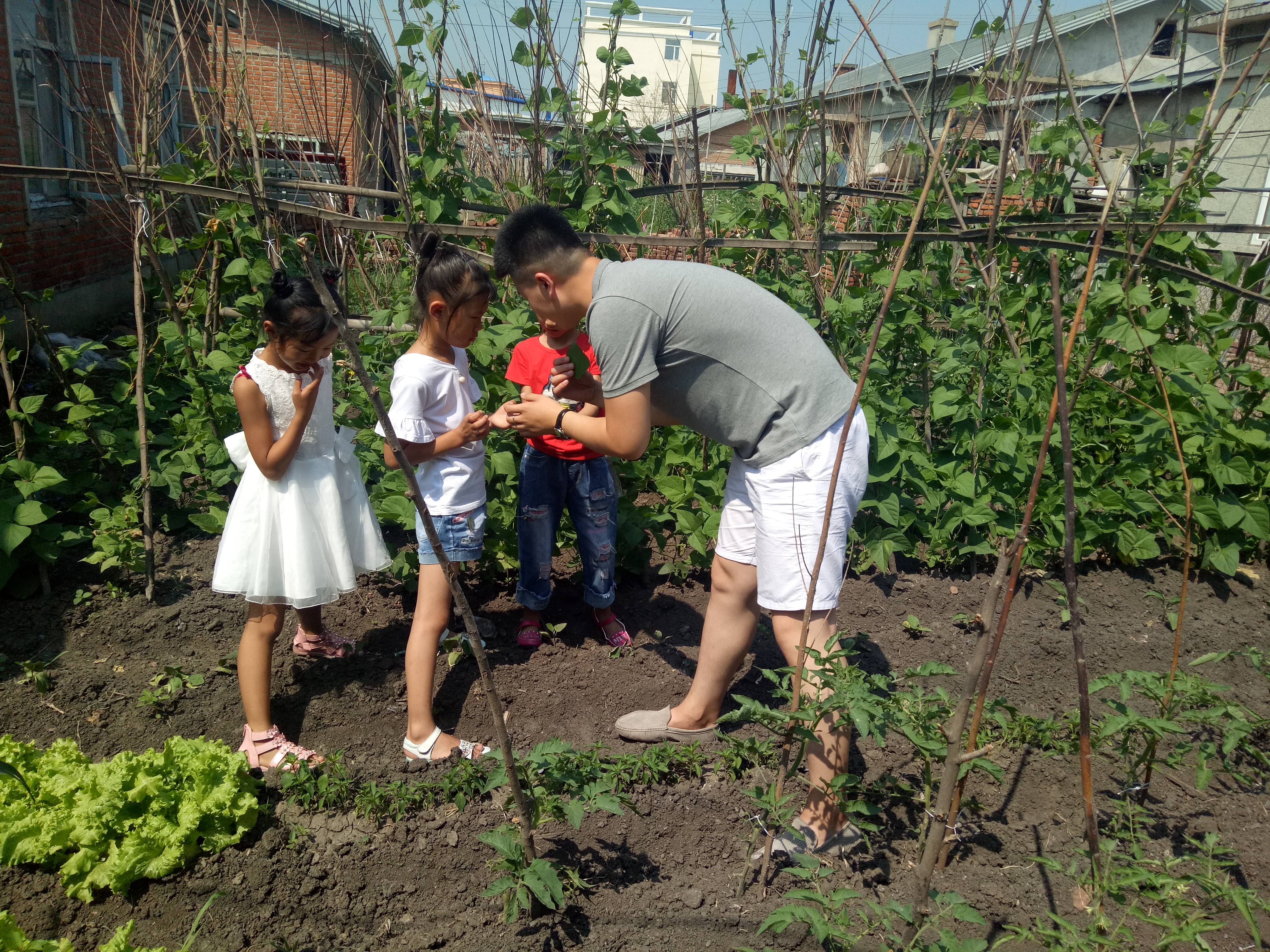 来到农家小菜园,才了解到“浓缩才是精华”的含义,种地面积丝毫没有影响到种植蔬菜的种类和质量。这个季节的部分蔬菜果实还没成熟。小朋友们一边好奇的问志愿者们“这是什么蔬菜?”一边把已经熟透了的瓜果柿子摘下来送给大哥哥大姐姐们。这个小小看似不经意间的举动让志愿者们心里一暖,可同时也给志愿者们出了难题,普遍大众蔬菜我们了解认识,可有些还没有果实并且冷门的蔬菜着实让我们也一筹莫展。还好有刘老师在,面对小朋友们接踵而来的问题,老师都一一详细的解答。志愿者及小朋友们对刘老师对蔬菜的认知、了解,充满钦佩之情。