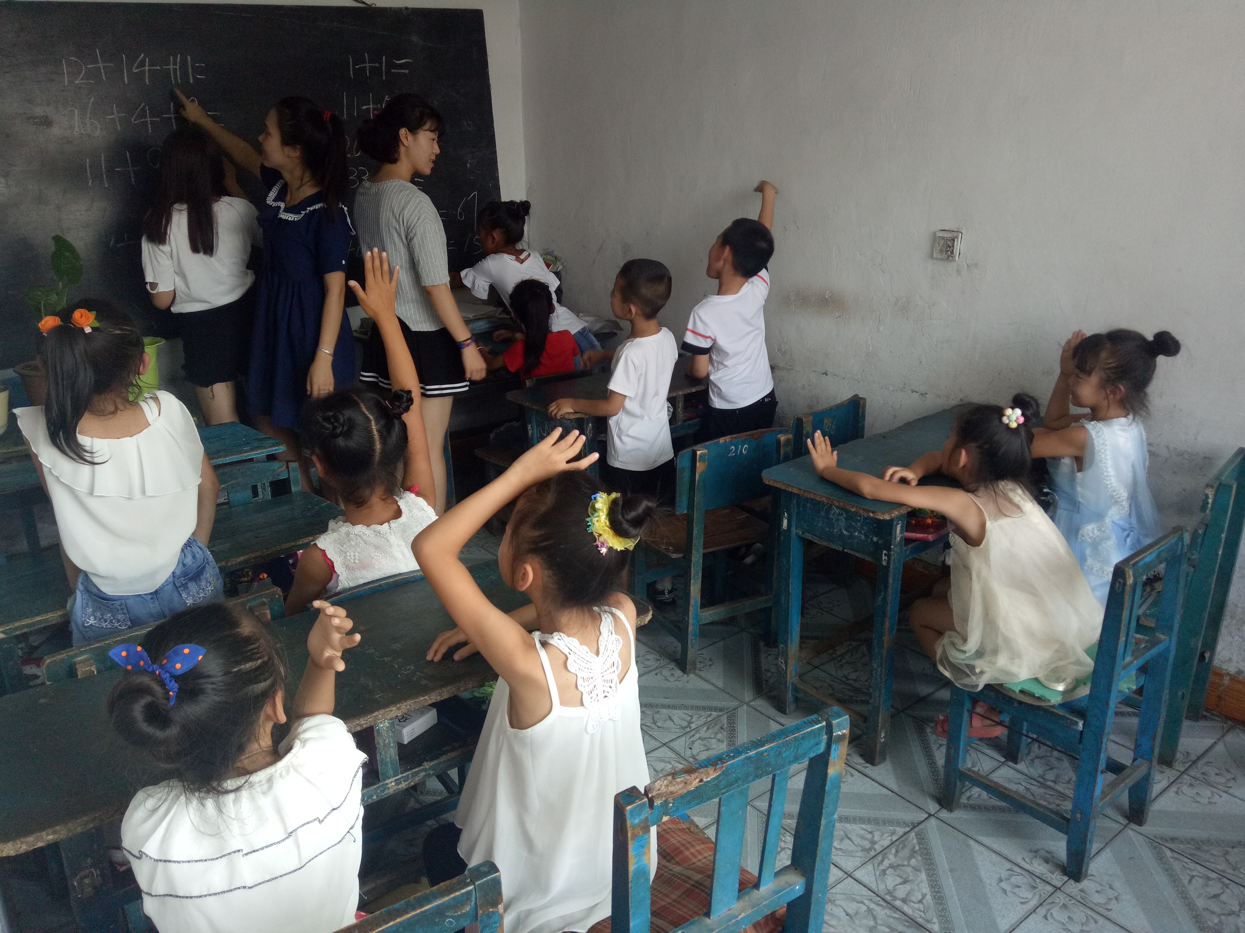小孩子们生活的另一方面,复习功课也是重要的。昨天志愿者们帮助小朋友们完成老师留的作业。今天我们决定给他们预习一下下周将要学习的功课。有的小朋友们在课堂上听的一板一眼,也有小朋友可能是跟我越发熟悉了,在课堂上吵着要喝水,还有些小朋友时不时的拉着志愿者说“哥哥你看我头发扎好了么”“姐姐,你看我写的对么”…虽然过程丰富多彩了些,但好在一上午时间一课时的预习完成了,所以我们决定下午的时候带领他们去农家菜园观赏了解植物,作为奖励。