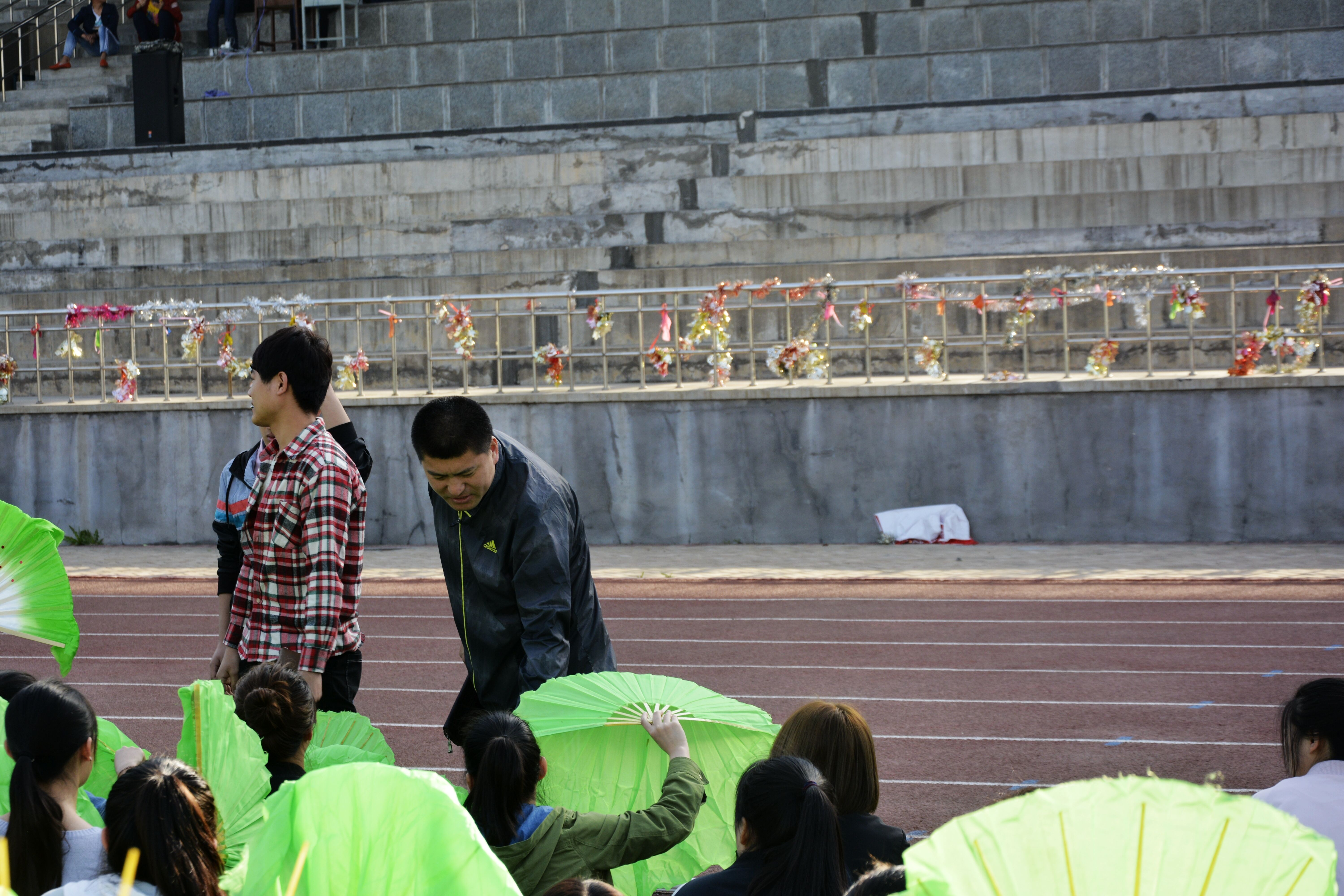 这次排练,同学们手上多了一种道具,两把绿白相间的舞蹈扇,跟随老师的哨声,动感的音乐,蹲下、起立、奔跑,一会儿又“分解”成一个个圆圈、麦穗、水滴、稻田,飞舞着扇子变换出各种姿势,形成一幅幅美丽的田园画卷。于老师轻松、诙谐、幽默的训练方式,为团体操枯燥的排练增添了无限的趣味。