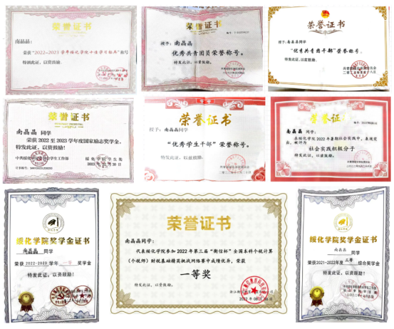 在校期间曾获得“社会实践积极分子”、“校级一等奖学金”、“国家励志奖学金”、“优秀共青团干部”、“优秀员工干部”、“优秀共青团员”等多项荣誉。