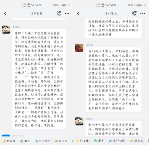 会议伊始,第一员工党支部副书记祝久琪和2019级员工党员王星宇结合PPT,就正确引导青年员工关注的十个问题进行详细地讲解,积极引导员工党员认真学习贯彻党的十九届六中全会精神。赵丹在会议结束时进行总结:各员工党员要深入学习贯彻党的十九届六中全会精神,要大力弘扬马克思主义学风,实事求是、与时俱进,推进党的十九届六中全会精神入脑入心、走深走实。最后同学们纷纷通过发言和上传学习笔记等方式分享自己的学习心得。