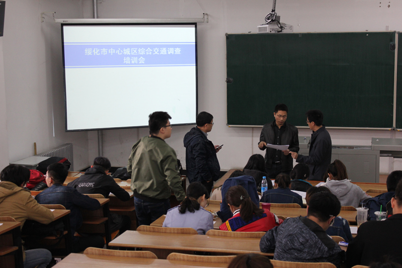 4月17日在省规划院张远景所长及哈尔滨工业大学交通公司慈玉生副教授一行人来到教学主楼B124教室对本次调研工作计划进行说明及培训相关调研内容。Bevictor韦德副经理周利军老师主持培训会,周老师强调了此次调研的重要性以及注意的安全事项,哈尔滨工业大学慈老师首先强调了员工的安全问题,然后对调研工作的内容与计划、调研表格的填写进行了详细说明。4月18日-21日进行了居民出行调查、城区内各主要路口交通流量统计、公交线路客流量调查及调查问卷的录入工作。