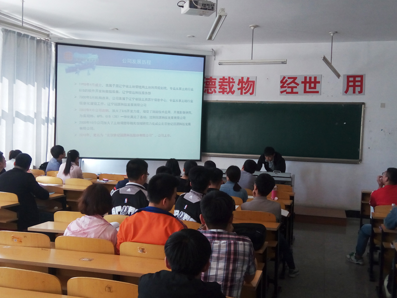 2017年5月25日沈阳国源科技有限公司高秀生经理在周利军经理的陪同下给2014级水利水电工程、人文地理与城乡规划专业进行实习招聘宣讲。高经理首先介绍了公司的概况,重点对实习岗位、工作地点、薪资待遇及就业后的发展趋势等员工比较关注的问题进行了讲述。沈阳国源科技有限公司是公司在2015年的实习就业基地,目前还有几名同学在该公司工作,此次招聘计划在公司招聘30人。
