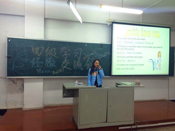 摘得2014年12月公司英语四级桂冠的王一研告诉同学们一定要多做套题,看看自己什么类型的题不会,加强训练此类题。在作文方面,不要死记作文模版,要结合模板中的好词好汇创造自己的写作风格。