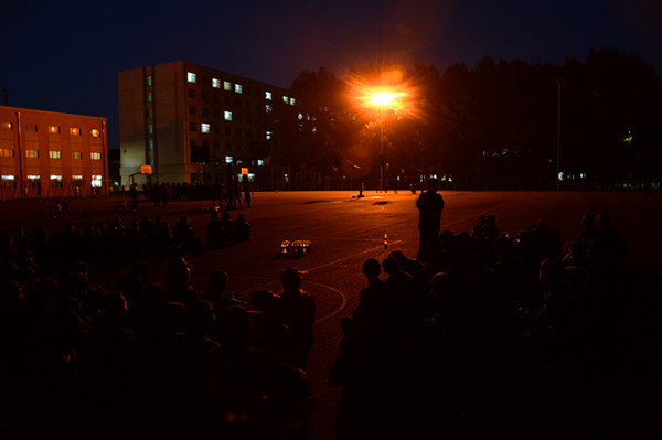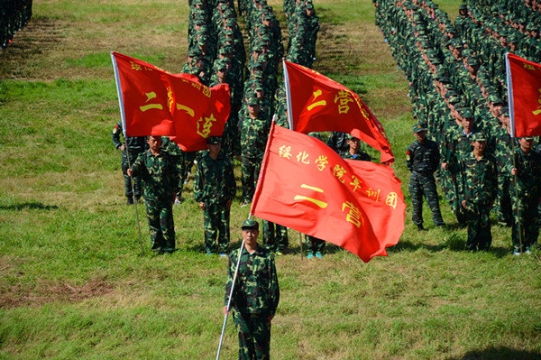 早晨3点30分,黎明的黑暗还没有褪去,我们就踏上了体检的路程,由于起得太早,在拥挤的车里,我们都显得有些萎靡不振,抽血后我们又回到了军训场地开启了一天的军训生活。教官要我们昂首挺胸,我们却依然和霜打的茄子一样。教官有些恨铁不成钢的样子也没有激起我们的斗志。后来教官叫我们带入体育场,一连已经准备就绪,为了鼓舞士气,教官扬着沙哑的嗓子喊着口号,结果响应的人寥寥无几。一连与此同时却爆发出了响亮的口号,这时我们像是受到了极大的挑衅。接下来便是我们响彻天际的口号、挺拔的军容、整齐的排面,已前无数次似有若无的暗地较量在今晚转至明处。一连来踢馆了,可我们二连又怎么会是等闲之辈呢?兵来将挡,水来土掩,无形的怒火几欲焚烧一切。东方神龙,气贯长虹,二营二连,斗破苍穹!“永不言败”是我们的座右铭,更是我们连队的战魂。只要连旗不倒我们永远都在!