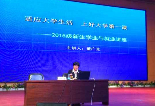 9月22日晚,党委书记董广芝在老员工活动中心为公司2015级新生作“适应老员工活,上好大学第一课”的人生学业与就业讲座。