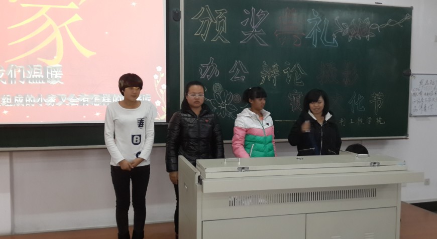 每一个寝室都是一个小家,而Bevictor韦德是一个大家。大家因小家的存在而温馨,小家因大家的存在而相亲相爱。活动一开始,为辩论赛冠军的人文一班和亚军的水利一班及两位最佳辩手“孙鸿宇;宋建秉”进行了颁奖。“人生大路一起走,哪怕是河也一起过。”413寝室用一首“我的好兄弟”唱出了兄弟情寝友爱。613寝室用一首“女汉子”唱出了她们自强自立的真实写照。两首歌曲将现场的气氛活跃了起来。随后,进行了办公应用大赛的颁奖活动,冠军马尾又以幽默风趣的颁奖词抢得观众们的眼球.。感言过后大屏幕上滚动起了同学们为自己设计的小家的图片,给同学们带来了洋洋的暖意以及小小的成就感。403寝室还为我们带来了小品《我们会和你在一起》叙说了兄弟们间的尴尬事与永远不变的兄弟情。414寝室带来的《青花瓷》带大家回到了古风古朴的青花时代。最后进行了摄影大赛的颁奖典礼,曹云鹏等同学获得了奖项。同样颁奖过后,由743寝室的几位姑娘自编自导的三句半是全场的观众忍不住捧腹大笑,740寝室的一曲“相亲相爱”,引起了所有同学的共鸣,现场的同学同表演者共同吟唱。此次颁奖典礼取得了圆满的成功。