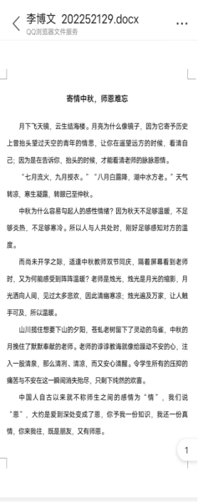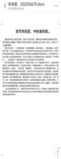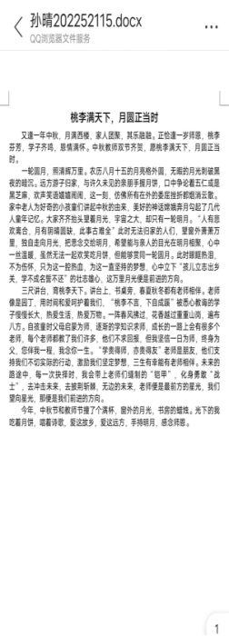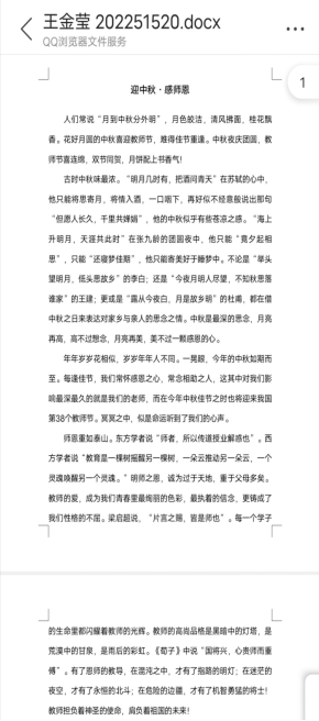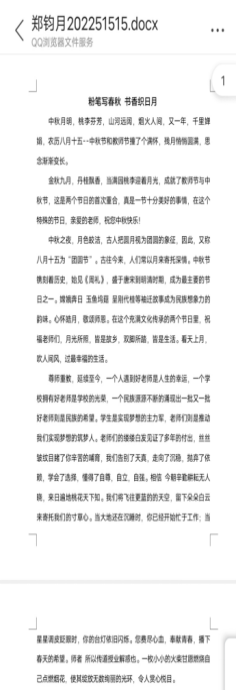 通过此次征文活动,不仅拓展了员工们的知识面,使其深刻感悟传统文化,还向同学们树立了传承、发扬中华优秀传统文化的意识与责任,大胆向老师表达心中的感恩思念,营造师生浓厚的情谊以及中秋和谐幸福的氛围,丰富了校园文化生活。