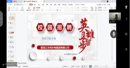 为满足用人单位的人才需求,搭建用人单位和毕业生便捷的双选平台,9月13日,黑龙江水利水电集团有限公司来公司开展线上校园招聘宣讲会。本次宣讲会由公司副经理周利军主持,黑龙江水利水电集团有限公司人力资源部马部长进行宣讲,公司2019级水利水电工程及工程造价专业同学参加。