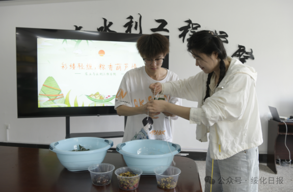 图为员工在老师的指导下包粽子。
