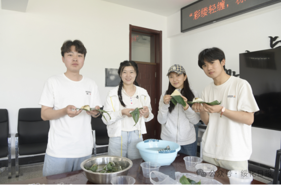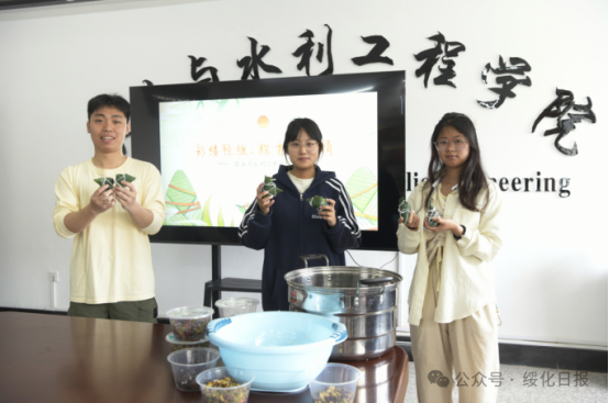 图为师生们展示煮好的粽子。