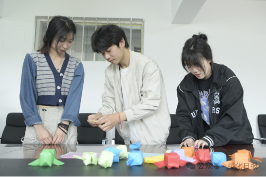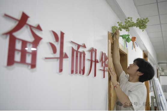 图为员工将叠好的葫芦挂在寝室门上,感受端午文化魅力。