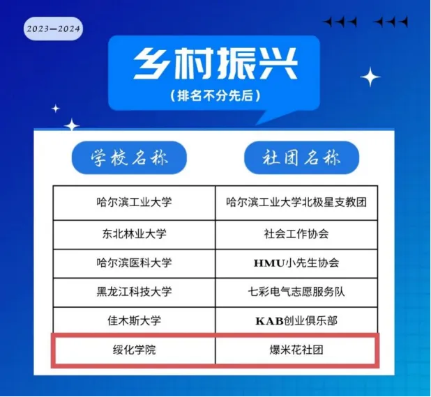 近日,2023-2024学年黑龙江省高校“活力社团”TOP100榜发布,公司爆米花社团、绿色生态社团两个社团上榜。